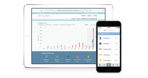 Symphony Home Comfort Platform Imagine a platform that can provide detailed feedback of your comfort system in real-time and the tools to control it all from any web-enabled smart phone, tablet, or computer. That's Symphony. Symphony is a Wi-Fi based comfort platform that's unsurpassed in its ease of use, feature set and the level of information it provides. Symphony marries the Aurora controls with our WebLink router, giving you access to the comfort system from practically anywhere. Symphony is cloud-based so there's no software to install and provides control over the entire geothermal system-not just the temperature as in other 'smart thermostat' systems. Aurora WebLink The Aurora WebLink router communicates directly with our Aurora control board rather than simply connecting to the thermostat. This provides you and your dealer with access to unit sensors, energy use and system information rather than the limited information a typical thermostat sees. Symphony Thermostats An internet-enabled thermostat allows homeowners to change temperature, set a schedule, monitor vacation mode, and more via smart phone or tablet. Connect to the personalized dashboard for remote functionality—all from the comfort of your sofa. Invisible Thermostats The concept of a dedicated thermostat is becoming outdated. If you'd rather not have a thermostat cluttering your walls, install an invisible flush-mount 'mud-in' temperature sensor (pictured above) and use a Symphony-based smartphone or tablet to control your home comfort levels instead. Water/Sump Alarm Symphony can also be expanded to prevent water damage from household equipment failure. External water sensors provide you email/text notification in the event of a sump pump malfunction or washer hose failure. Advanced Zoning System Remotely control temperatures and programs in up to six areas of your home with our IntelliZone2 zoning system. Symphony Dashboard The personalized dashboard provides quick access to your system's settings, operational status and history, alert history, energy usage, and zone temperatures as well as local weather. Energy Monitoring Symphony gives you the power to monitor and track your unit's energy use instantaneously or as a daily, weekly or 13-month history. Graphs give you the power to track trends visually and the information you need to reduce consumption even further. Make tweaks to your zoning or main thermostat and watch the effect on your bills! Monitor a Second Home Symphony has the capability to monitor multiple units in multiple locations. This means you can monitor a second home and its local surrounding weather from miles away. Symphony can even send a notification to you when power is off at the home. Your installing dealer will also be able to monitor your heat pump operation remotely as well. Peace of Mind Symphony can provide equipment alerts and service reminders via email, text message, and in-app notifications. And, not only will you receive alerts—so will your HVAC contractor. A service tech can log into your system to view faults, operating conditions and sensor readings—all without having to visit the home. If a service call is needed, the contractor can begin working on the solution immediately—saving your valuable time. Zoning System With the optional IntelliZone2 zoning system you can precisely regulate temperatures in up to six areas of your home. Gone are the days of needing to endure a hot upstairs bedroom or being forced to heat a guest bedroom that's only used during the holidays. In-house Development Symphony is compatible with 3, 5 and 7 Series water to air geothermal products. That means it's custom-tailored for your unit and isn't reliant on a third party for additional development or changes.